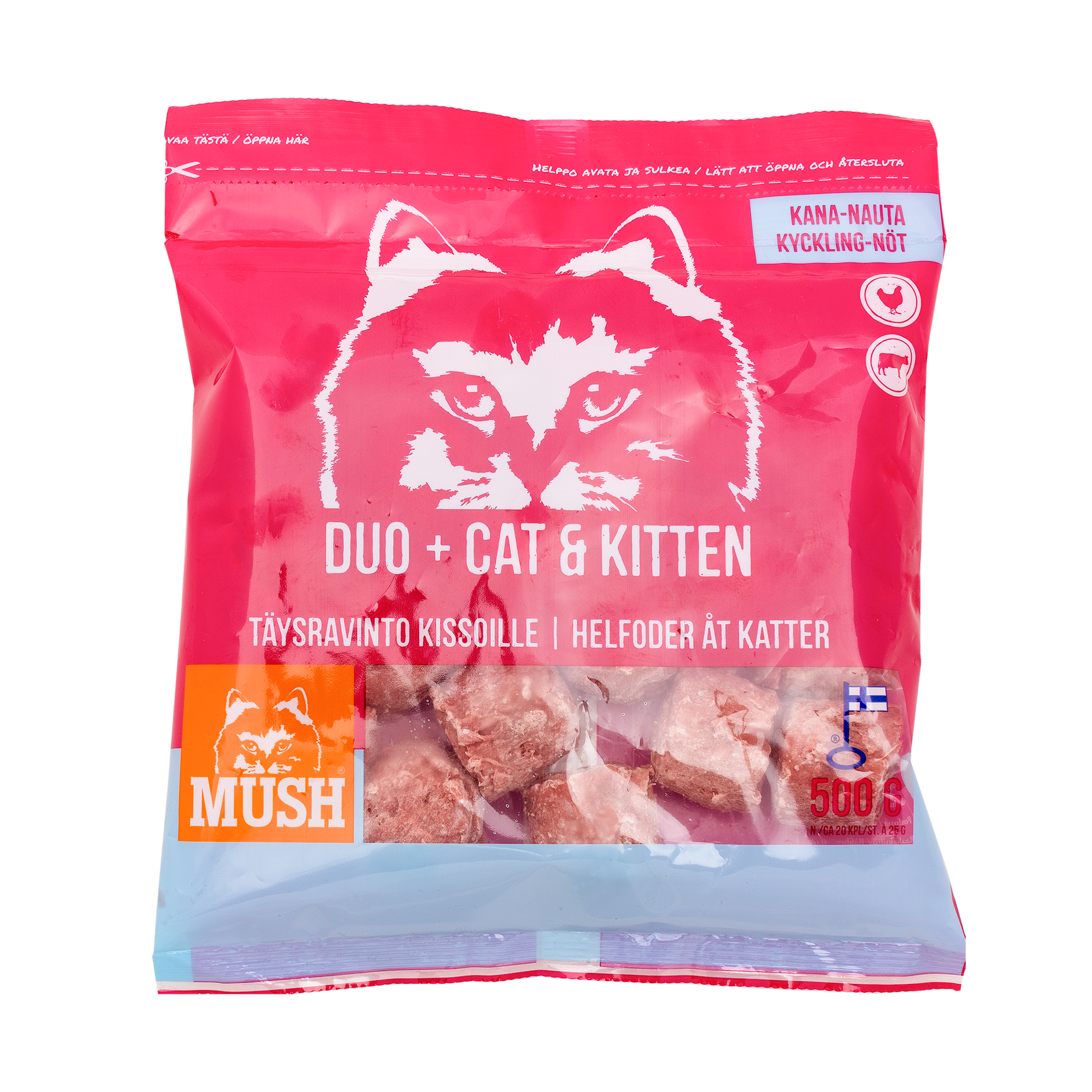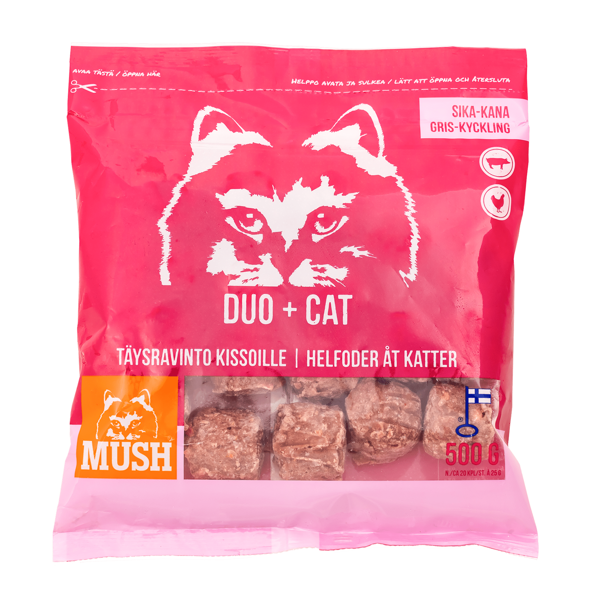 MUSHilla valmistamme ruokaa, jossa vain paras on riittävän hyvä kissoille. Kaikki DUO+ -sarjan tuotteet valmistetaan täällä Suomessa, puhtaista ja laadukkaista raaka-aineista.