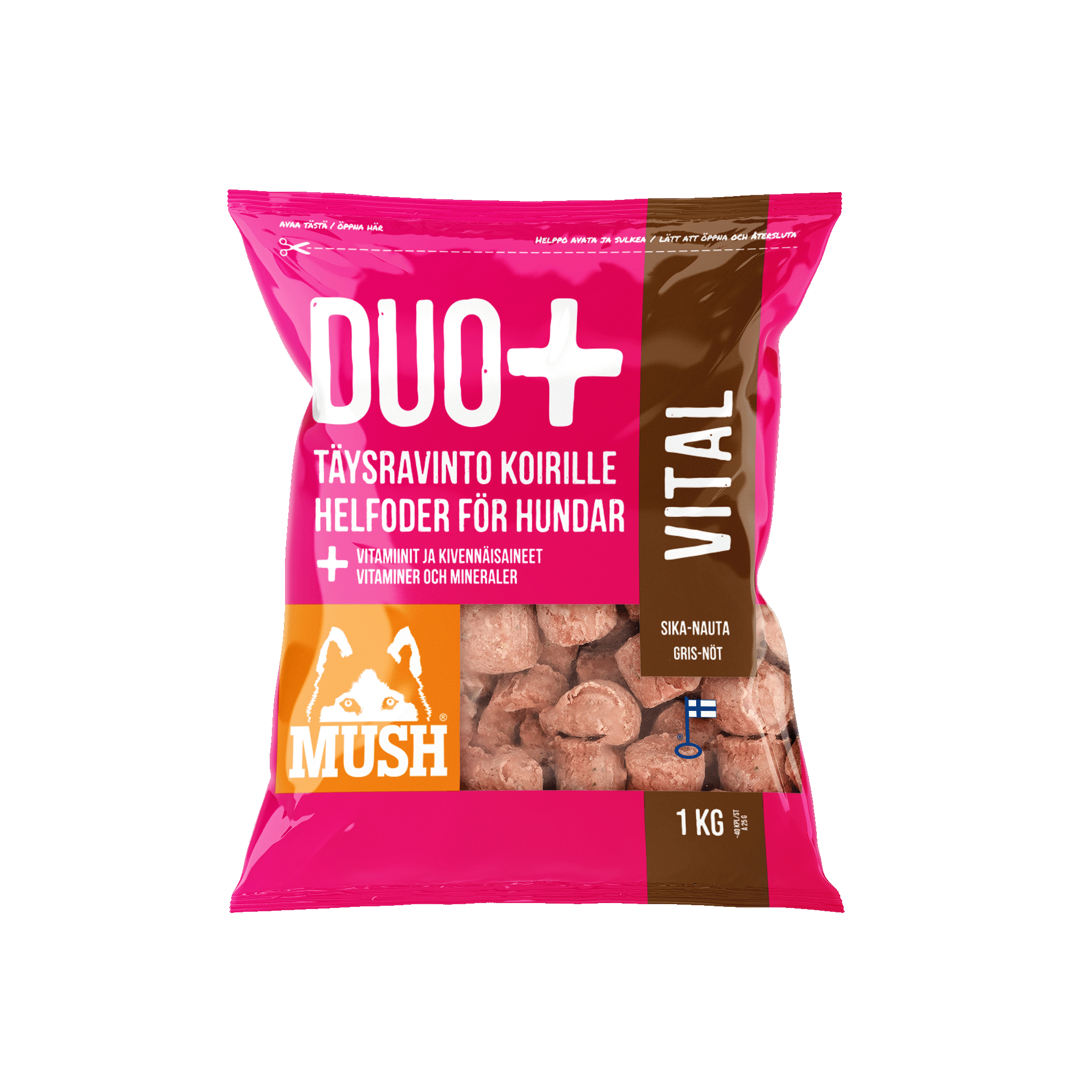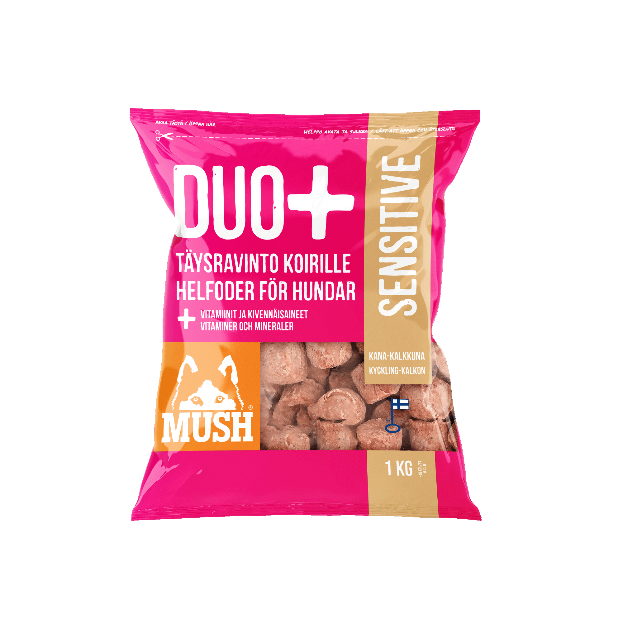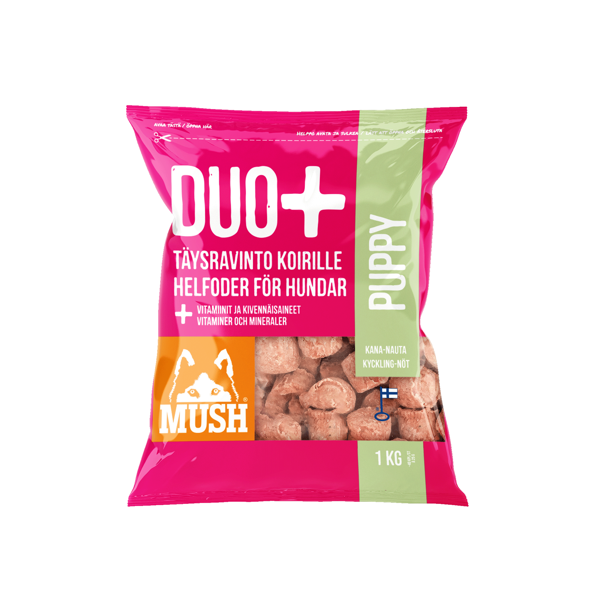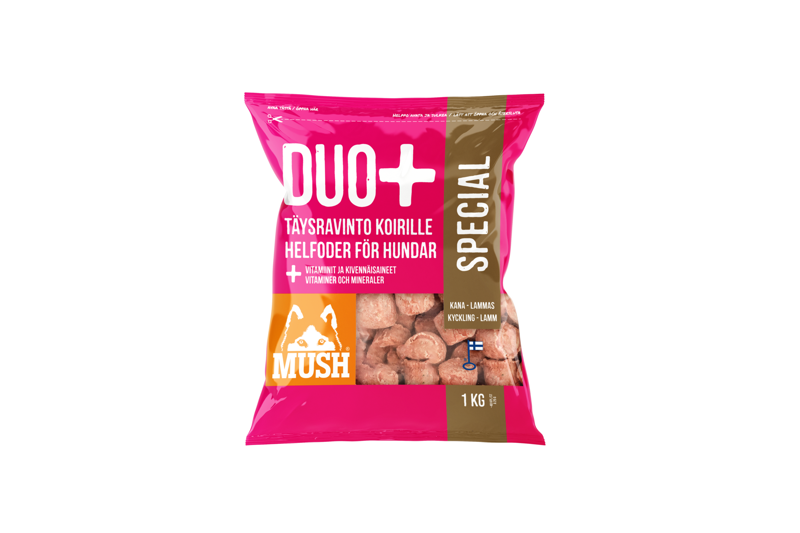 MUSH DUO+ -sarja on suunniteltu lemmikkisi todellisiin tarpeisiin: helppokäyttöinen, täysin kotimainen, vitaminoitu täysravinto, kaikki samassa paketissa. Viljaton, täsmällisesti koostettu resepti ilman turhia täyteaineita antaa mielenrauhan sinulle ja parasta ravintoa lemmikillesi.