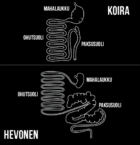 Viimeisenä katse suolistoon. Kasvisruokavalio vaatii enemmän prosessointia keholta ja siten myös pidemmän suoliston kehon kokoon nähden. Lehmillä ja hevosilla on kehoonsa nähden hyvin pitkä suolisto, koiralla ja kissalla lyhyt.