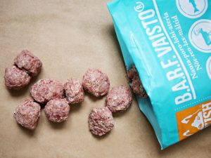 Hellä fullfôr inneholder ingen ben og er skånsomt for magen. Et annet alternativ er å begynne med små smaksprøver av våre benfrie alternativer i Basic-serien t.eks. Basic Storfevom. Bland en eller flere tinte Hellä- eller Basic-boller med vann til en grøtaktig konsistens, gi små mengder i starten, og øk porsjonene litt for hver dag. Når valpene har vent seg til måltider med fast føde, kan du begynne å blande inn litt Vaisto Puppy Isblå eller Lyslilla sammen med det benfrie fôret og vannet. Dersom du synes noen benbiter fortsatt virker litt store, kan du plukke ut enkelte biter, men ikke alle. Øk gradvis mengden Vaisto Puppy og reduser mengden benfritt til valpene er helt tilvendt Vaisto Puppy.