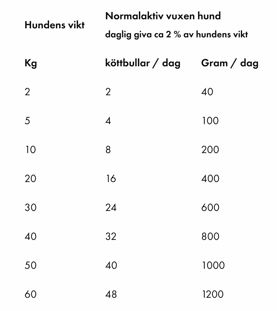 I tabellen har vi satt sammen en gjennomsnittlig mengde mat for voksne hunder. Husk at dette bare er en omtrentlig mengde, og det som passer akkurat din hund kan avvike fra tabellen.