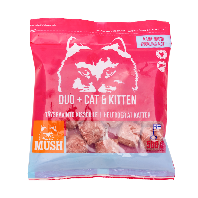 MUSH DUO+ CAT&KITTEN® Kana-nauta on täysravintomme kissoille, joka on kehitetty sinulle joka haluat antaa kissallesi lajityypillistä ruokaa ja olla varma siitä että kissasi saa kaiken tarvitsemansa ruoasta. Täysrehu kissoille, sopii myös kissanpennuille.