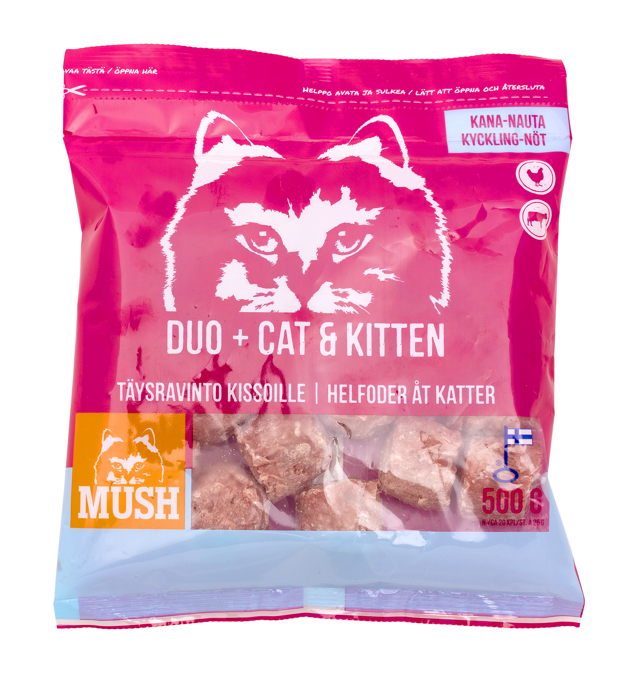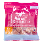 MUSH DUO+ CAT&KITTEN® on pakattu 500g painoiseen, uudelleensuljettavaan pussiin, josta on helppo ottaa tarvittava määrä ruokaa kerrallaan pakkasesta sulamaan.