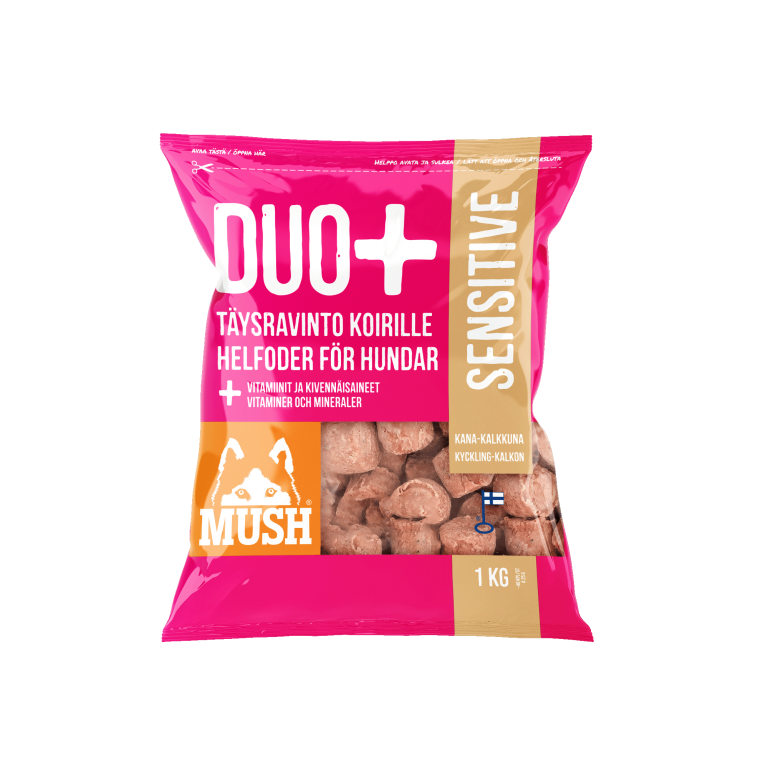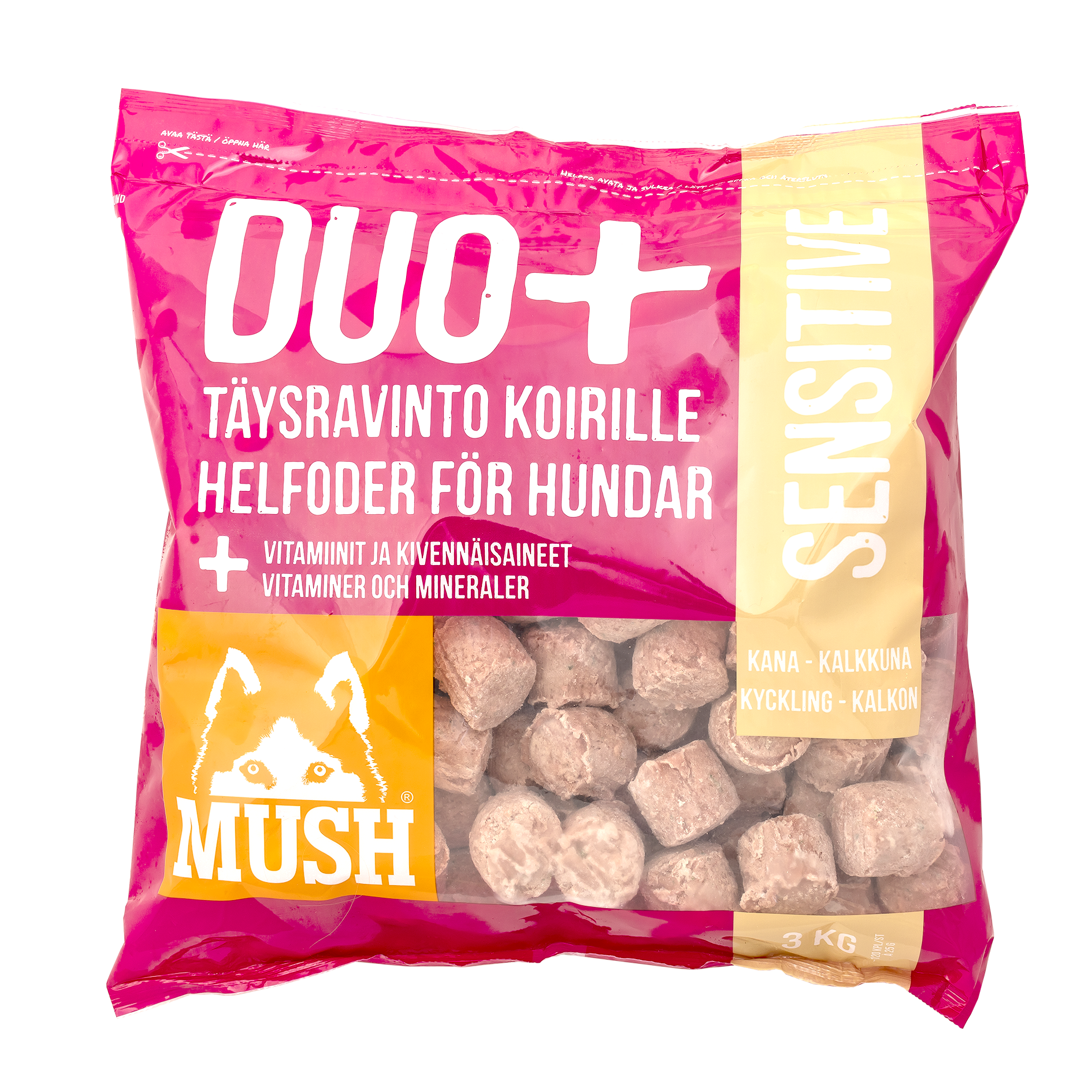 MUSH DUO+ Sensitive (kana-kalkkuna) on helposti sulava täysravinto, sopii myös hyvin herkkävatsaisille koirille.