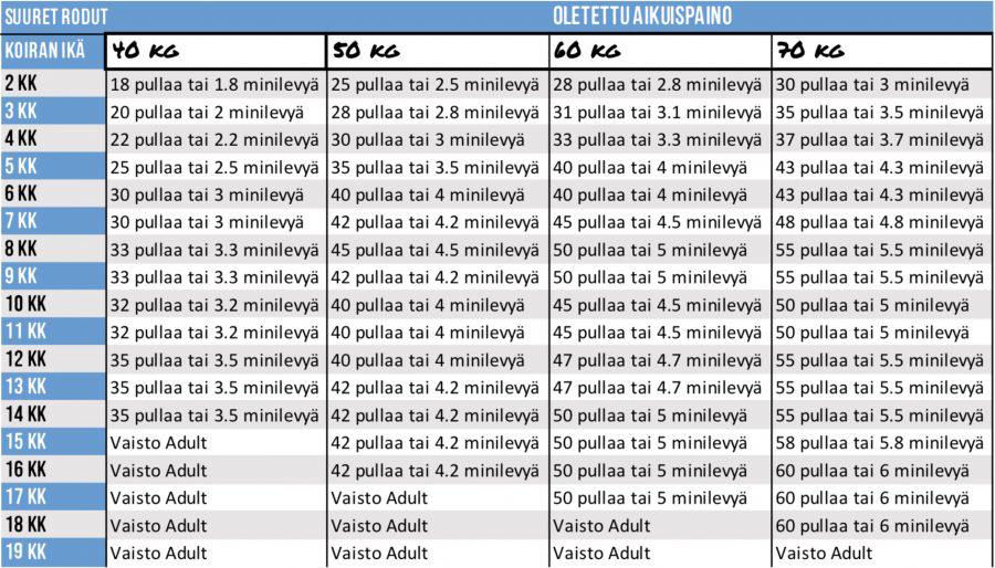 Alla olevissa tauluissa olemme koonneet keskimääräisen ruokamäärän pennuille eri ikäryhmissä ja roduissa. Muista, että tämä on vain suuntaa-antava määrä ruokaa, joten se, mikä sopii juuri sinun pennullesi, voi poiketa taulusta. Seuraa pennun kasvua ja pidä se pirteänä, iloisena ja hoikkana – säädä ruokamäärää sen mukaan.