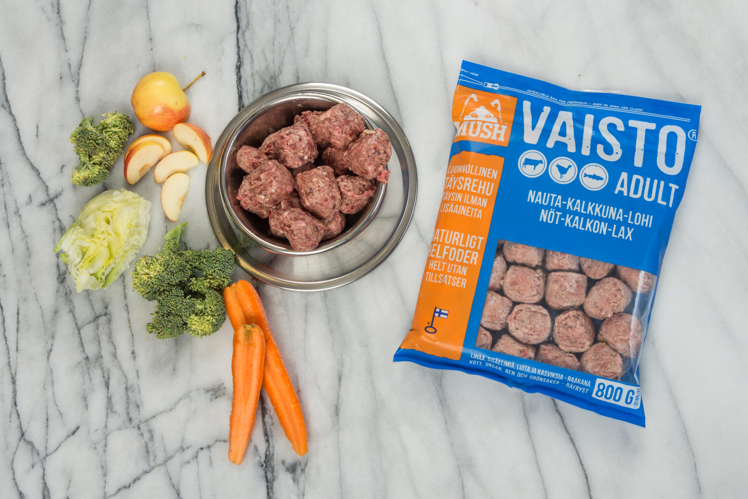 Vaisto tuotteet ovat täysin lisäaineettomia, kaikki tarvittavat ravintoaineet tulevat ensiluokkaisista, pääosin kotimaisista raaka-aineista ja tästä syystä niihin ei ole lisätty edes vitamiineja! Raaka-aineet ovat myös mahdollisimman prosessoimattomia; Ne toimitetaan meille, jauhetaan, sekoitetaan ja pakastetaan. Muuta käsittelyä ne eivät tarvitse.